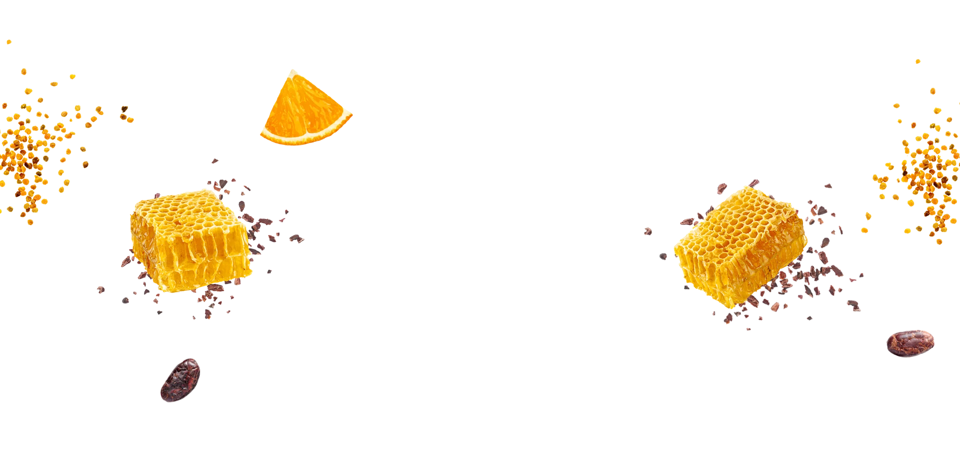 Sirovi cvetni med, sirovi bagremov med, sirovi bademi, liofilizovana pomorandža, sirovi kakao, lešnici, sirovi propolis, prirodni acerola višnja vitamin C, prirodni vitamin E, psilijum ljuspice, ekstrakt semena grožđa.